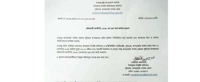 ২৭ সেপ্টেম্বর শনিবার দুপুরে গুইমারা উপজেলাতে ১৪৪ জারি করেন গুইমারা উপজেলা নির্বাহী অফিসার ও নির্বাহী ম্যাজিষ্ট্রেট আইরিন আকতার। ফৌজদারি কার্যবিধির ১৮১৮ মোতাবেক ১৪৪ ধারা পরবর্তী নির্দেশ না দেওয়া পর্যন্ত বলবৎ থাকবে।