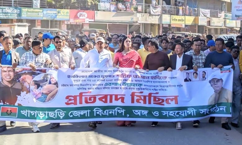 ইনকিলাব মঞ্চের মুখপাত্র ও ঢাকা-৮ আসনের স্বতন্ত্র প্রার্থী শরিফ ওসমান হাদি এবং চট্টগ্রাম-৮ আসনের বিএনপি মনোনীত প্রার্থী ও চট্টগ্রাম মহানগর বিএনপির আহবায়ক এরশাদ উল্লাহকে গণসংযোগ চলাকালে গুলি করে হত্যার চেষ্টার ঘটনায় তীব্র প্রতিবাদ জানিয়েছে খাগড়াছড়ি জেলা বিএনপি।