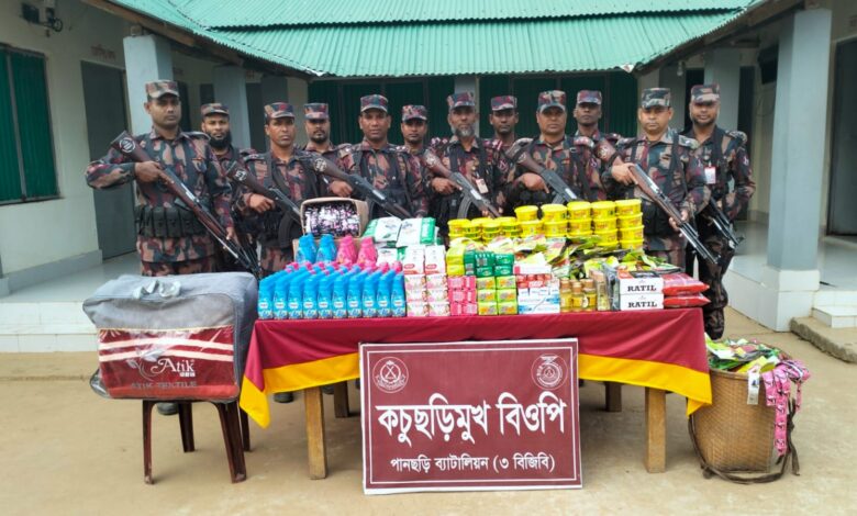 খাগড়াছড়ির পানছড়ি উপজেলার কচুছড়ি মুখ সীমান্ত এলাকায় অভিযান চালিয়ে বিপুল পরিমাণ ভারতীয় অবৈধ বিভিন্ন প্রকার মালামাল আটক করেছে ৩ বিজিবি লোগাং জোন।