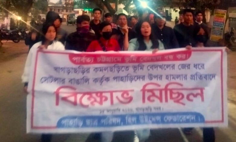 কমলছড়িতে পাহাড়িদের ওপর হামলার প্রতিবাদে খাগড়াছড়িতে বিক্ষোভ