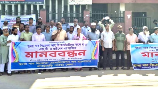 আইডি কার্ডধারী খুচরা সার বিক্রেতাদের বহাল রাখা ও টি.ও (ট্রান্সপোর্ট অর্ডার) লাইসেন্স প্রদানের দাবিতে খাগড়াছড়িতে মানব বন্ধন ও স্মারকলিপি দিয়েছে খুচরা সার বিক্রেতা এসোসিয়েশন।