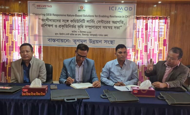 খাগড়াছড়িতে তৃণমূল উন্নয়ন সংস্থার উদ্যোগে “জিইএসআই সমন্বিত প্রকৃতি নির্ভর সমাধানের মাধ্যমে পার্বত্য অঞ্চলে জলবায়ু স্থিতিস্থাপকতা বৃদ্ধি” প্রকল্পের অংশ হিসেবে অংশীদারদের সঙ্গে কমিউনিটি লার্নিং সেন্টারের অগ্রগতি পর্যালোচনা, প্রশিক্ষণ এবং প্রকৃতি নির্ভর কৃষি সম্প্রসারণে সমন্বয় সভা অনুষ্ঠিত হয়েছে।