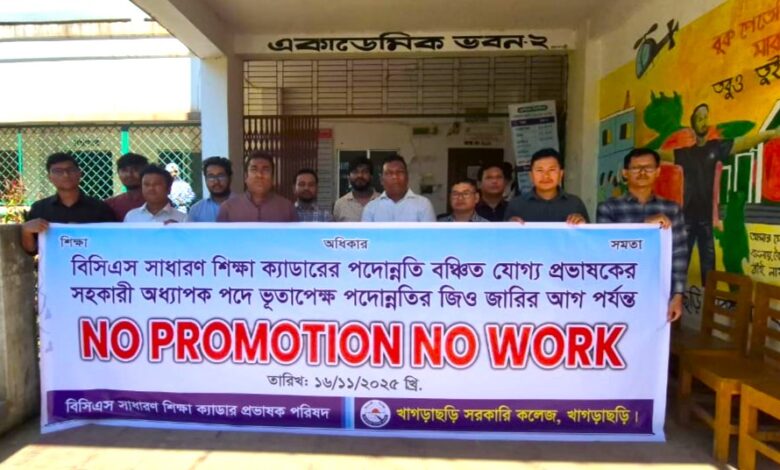 দীর্ঘদিনের পদোন্নতি বঞ্চনার প্রতিবাদে খাগড়াছড়িতে বিসিএস সাধারণ শিক্ষা ক্যাডারের প্রভাষকেরা শুরু করেছেন “পদোন্নতি না হলে কর্মবিরতি” কর্মসূচি।
