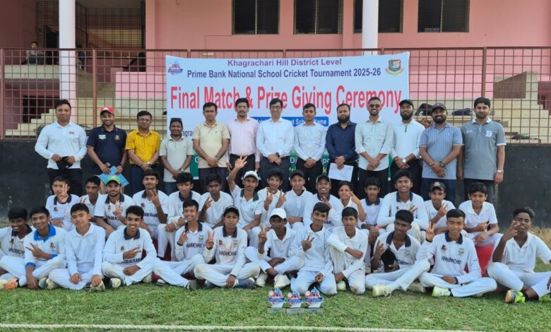 খাগড়াছড়ি জেলায় অনুষ্ঠিত প্রাইম ব্যাংক জাতীয় স্কুল ক্রিকেট প্রতিযোগিতা ২০২৫-২৬-এর ফাইনাল ও পুরস্কার বিতরণী অনুষ্ঠান জমজমাট ও প্রতিদ্বন্দ্বিতাপূর্ণ ম্যাচের মধ্য দিয়ে সম্পন্ন হয়েছে। রুদ্ধশ্বাস এই ফাইনালে দুর্দান্ত দলীয় পারফরম্যান্সে চ্যাম্পিয়ন হওয়ার গৌরব অর্জন করেছে খাগড়াছড়ি পুলিশ লাইন্স স্কুল।