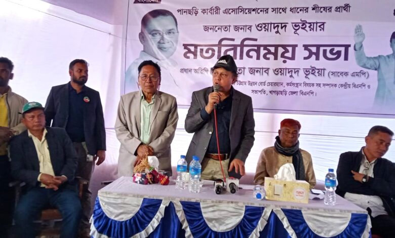 দুপুরে চৌধুরী পাড়ায় কারবারী এসোসিয়েশনের সভাপতি হেম রঞ্জন চাকমা’র সভাপতিত্বে মতবিনিময় কালে ধানের শীষের প্রার্থী ওয়াদুদ ভূইয়া বলেন, “আপনাদের সঙ্গে বসা মানে পুরো গ্রামের মানুষের সঙ্গেই বসা। সাম্প্রদায়িক সম্প্রীতি রক্ষায় যা যা করা প্রয়োজন, তা আমরা সম্মিলিতভাবে করব। পাহাড়ি-বাঙালি বিভাজন সৃষ্টির সব অপচেষ্টা বন্ধ করে ঐক্য ও সহাবস্থানের পরিবেশ গড়ে তুলবো।”