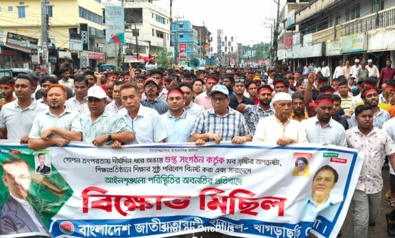 গোপন মব তৎপরতা,ষড়যন্ত্র ও সহিংসতার প্রতিবাদে খাগড়াছড়িতে ছাত্রদলের বিক্ষোভ মিছিল