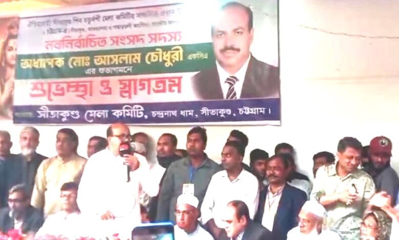 স্বাগত বক্তব্যে অ্যাডভোকেট চন্দন দাশ বলেন, আসলাম চৌধুরী এই তীর্থক্ষেত্রের উন্নয়নে আন্তরিক। ছয় মাস আগেও তিনি পাহাড়চূড়ায় অবস্থিত মন্দির পরিদর্শন করে উন্নয়ন পরিকল্পনার কথা জানিয়েছিলেন। বর্তমানে তিনি সংসদ সদস্য; ভবিষ্যতে মন্ত্রী হলে এবং চন্দ্রনাথ ধামের উন্নয়নে সুদৃষ্টি দিলে তীর্থযাত্রীদের দীর্ঘদিনের দুর্ভোগ লাঘব হবে।