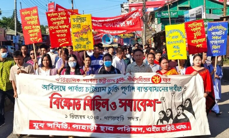পার্বত্য চট্টগ্রাম চুক্তির পূর্ণাঙ্গ বাস্তবায়নের দাবিতে খাগড়াছড়িতে বিক্ষোভ মিছিল ও সমাবেশ অনুষ্ঠিত হয়েছে।
