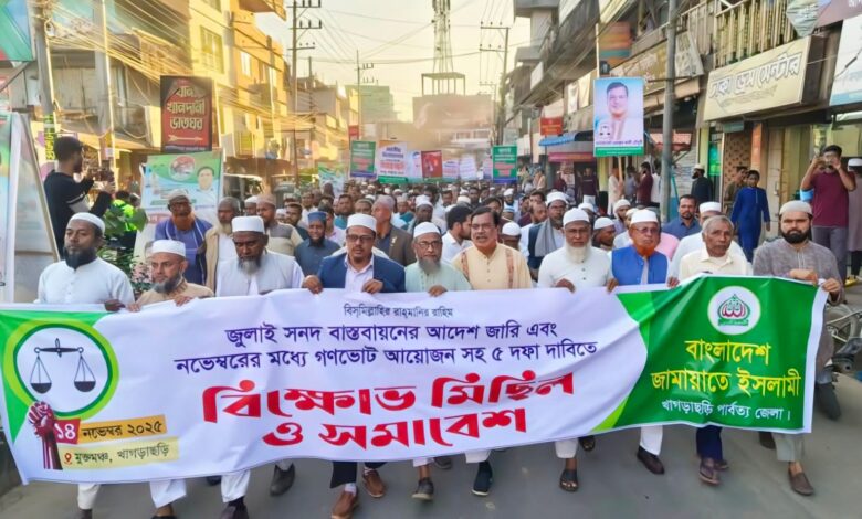 জুলাই সনদ বাস্তবায়নের আদেশ জারি ও নভেম্বরের মধ্যে গণভোট আয়োজনসহ ৫ দফা দাবিতে খাগড়াছড়িতে বিক্ষোভ মিছিল ও সমাবেশ করেছে বাংলাদেশ জামায়াতে ইসলামীর খাগড়াছড়ি জেলা শাখা।