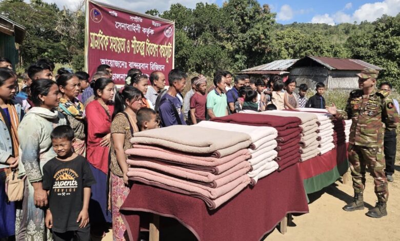 বিজয়ের মাসে মানবিক সহায়তার অংশ হিসেবে বান্দরবানের রুমা ও থানচি উপজেলার সীমান্তবর্তী দুর্গম পাহাড়ি এলাকায় অসহায় ও দরিদ্র ক্ষুদ্র নৃ-গোষ্ঠী সম্প্রদায়ের মাঝে শীতবস্ত্র বিতরণ করেছে বাংলাদেশ সেনাবাহিনী।