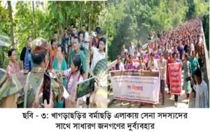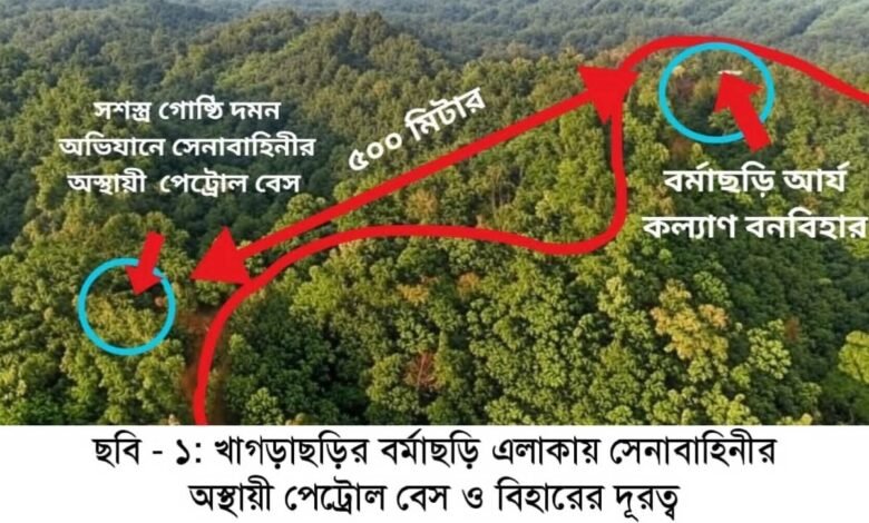 খাগড়াছড়ি : পার্বত্য চট্টগ্রামের নিরাপত্তা ও স্থিতিশীলতা বজায় রাখার লক্ষ্যে বাংলাদেশ সেনাবাহিনী খাগড়াছড়ির বর্মাছড়ি এলাকায় দীর্ঘমেয়াদী অভিযান পরিচালনা শুরু করার পরিপ্রেক্ষিতে ইউনাইটেড পিপলস ডেমোক্রেটিক ফ্রন্ট (ইউপিডিএফ) একটি পরিকল্পিত নাশকতামূলক কর্মকাণ্ডের মাধ্যমে জনগণের ধর্মীয় অনুভূতিকে ব্যবহার করে পরিস্থিতি অস্থিতিশীল করার চেষ্টা করছে। সার্বিক পরিস্থিতি ও সম্ভাব্য সাম্প্রদায়িক দাঙ্গা এড়াতে সেনাবাহিনী বর্মাছড়িতে স্থাপিত অস্থায়ী পেট্রোল বেসটি অন্যত্র সরিয়ে নেওয়ার সিদ্ধান্ত গ্রহণ করেছে। তবে পার্বত্য অঞ্চলে স্থানীয় জনগণের নিরাপত্তা নিশ্চিত করতে সেনা অভিযান অব্যাহত থাকবে।