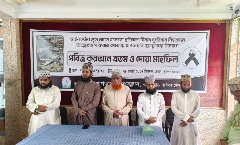 মাইলস্টোন স্কুল অ্যান্ড কলেজের প্রশিক্ষণ বিমান দুর্ঘটনায় নিহতদের আত্মার মাগফিরাত কামনায় খাগড়াছড়ি প্রেসক্লাবের উদ্যোগে পবিত্র কুরআন খতম ও দোয়া মাহফিল অনুষ্ঠিত হয়েছে।