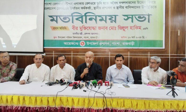 ১৬ মার্চ ২০২৪ ,শনিবার দুপুরে পাংশা উপজেলা প্রশাসন আয়োজিত উপজেলা পরিষদ মিলনায়তনে পাংশা রেলওয়ে স্টেশন এলাকায় রেলওয়ে ভুমি হতে অবৈধ দখলদারদের উচ্ছেদ বিষয়ে বাংলাদেশ রেলওয়ের ঊর্ধ্বতন কর্মকর্তা, স্থানীয় প্রশাসন ও বাসিন্দাদের উপস্থিতিতে মতবিনিময় সভায় প্রধান অতিথির বক্তব্যে রেলপথ মন্ত্রী বীর মুক্তিযোদ্ধা মো. জিল্লুল হাকিম এমপি এসব কথা বলেন।