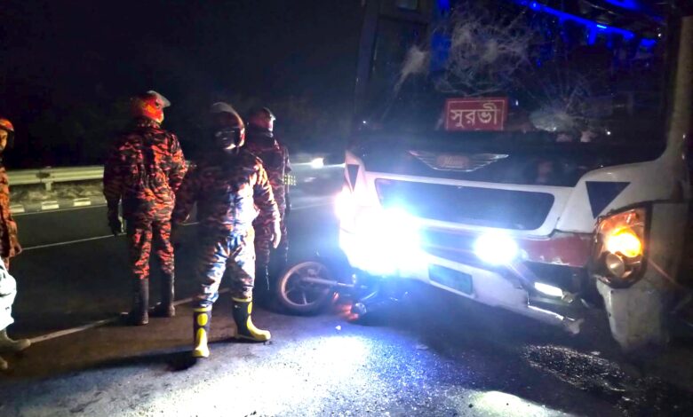 শ্রীনগর ফেরিঘাটে বাস চাপায় মোটরসাইকেল আরোহীসহ নিহত দুই জন।