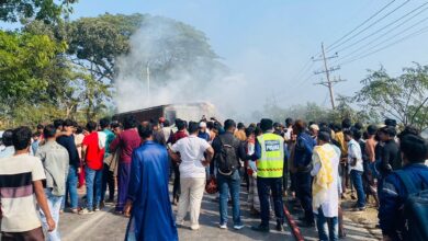 দাউদকান্দিতে দুর্ঘটনা কবলিত বাসে আগুন